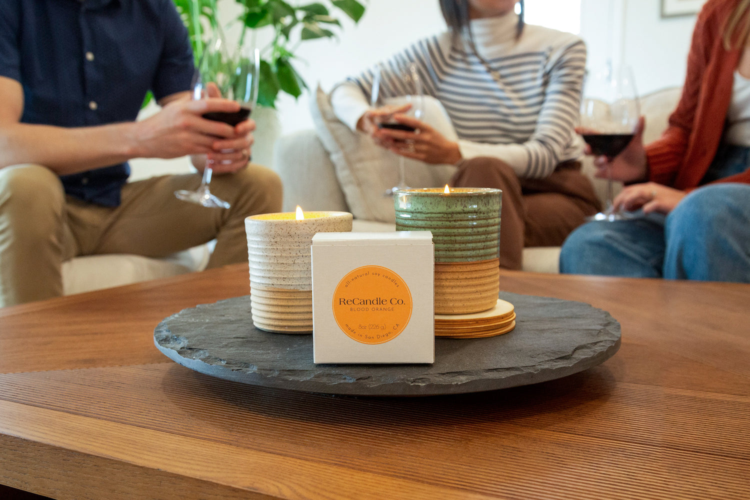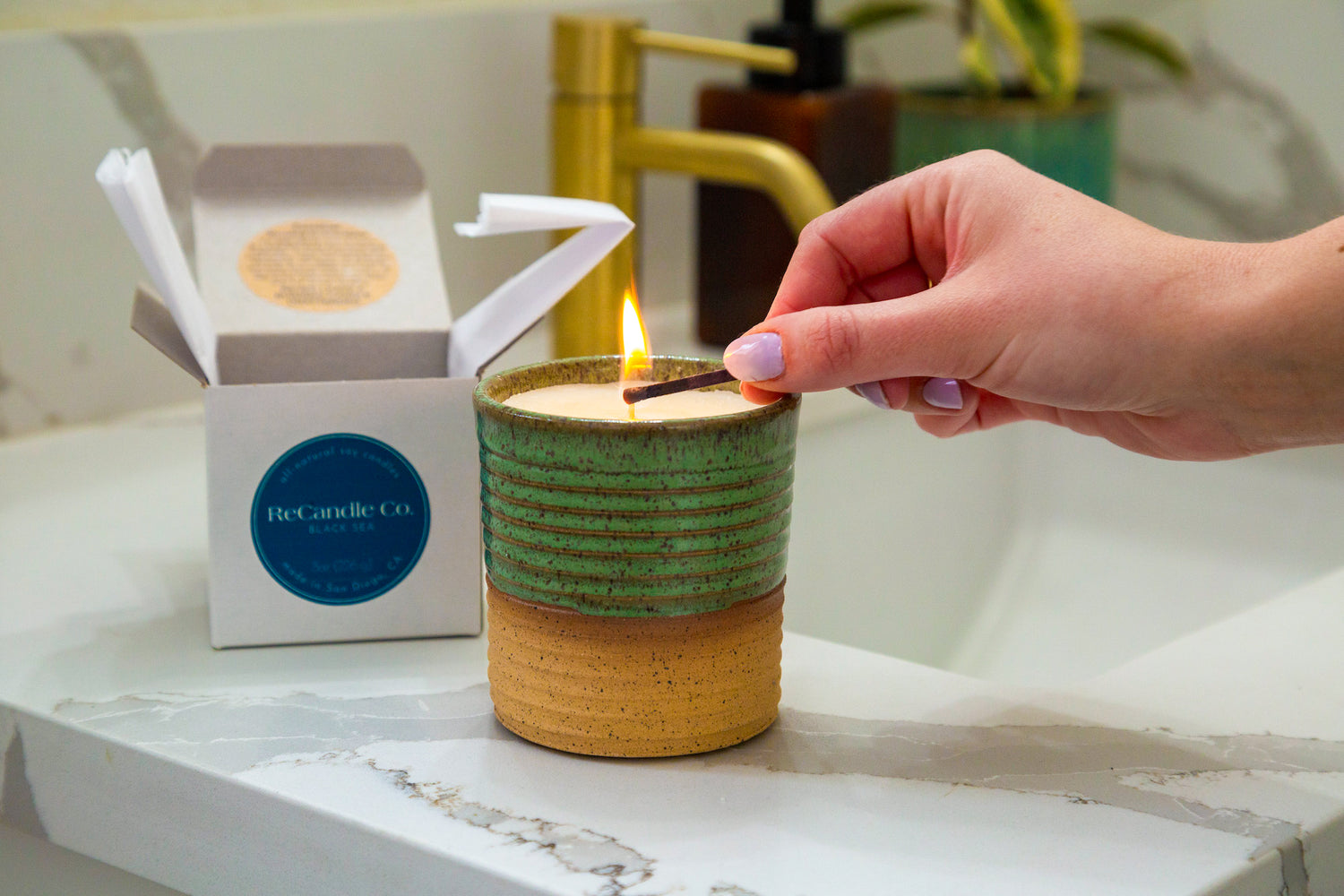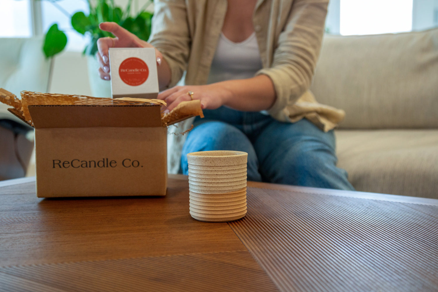 Your first shipment includes our signature ReCandle starter kit - this contains one handcrafted ceramic vessel made locally in California by our artisan partners using natural clay, paired with your choice of soy wax candle scent. All subsequent subscription shipments after that initial box contain soy wax candle refills to reuse your existing jar.