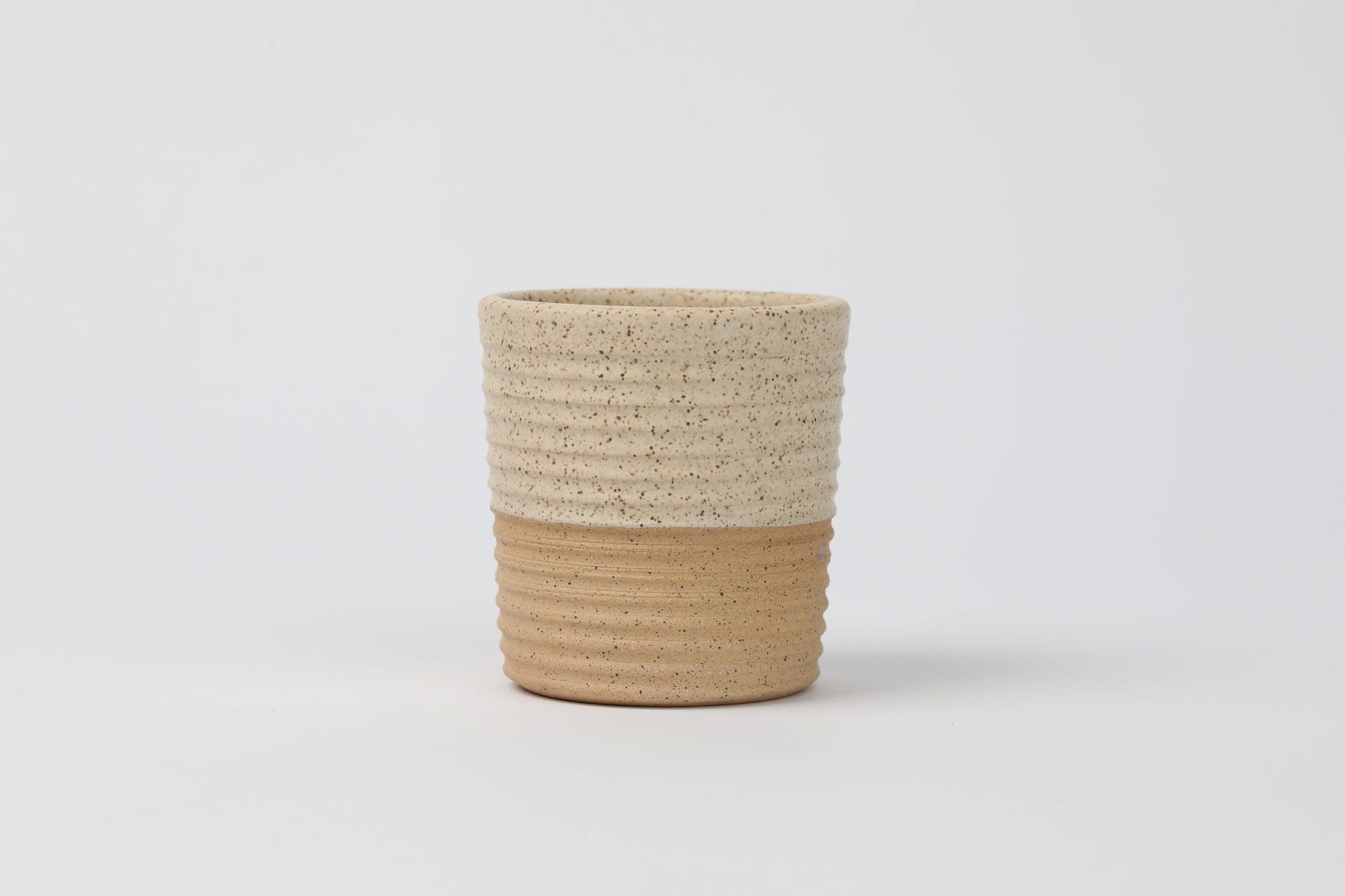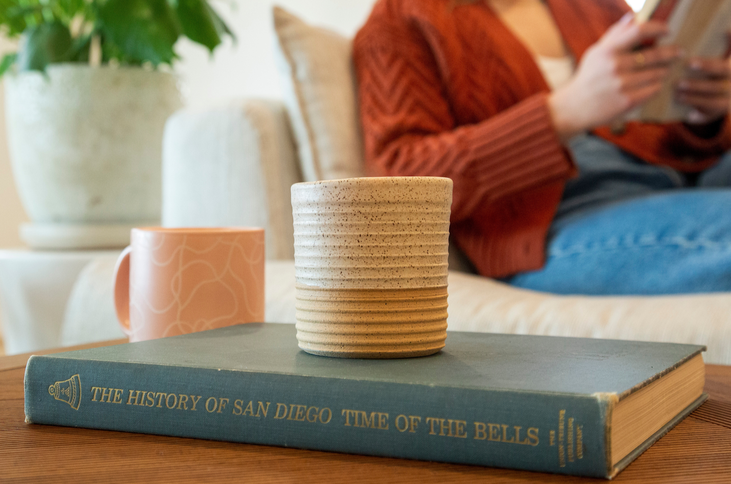 Our signature vessel is locally handcrafted from natural stoneware clay in Oceanside, CA by a small-batch artisan. The earthy, hand-carved ceramic candle container feels soothing to the touch and provides a one-of-a-kind, modern feel. Since our proprietary soy wax easily pops in and out of the unbranded ceramic candle holder, the stoneware candle jar maintains integrity through unlimited reuse.